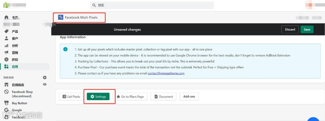 可使用shopify插件进行连接。首先在shopify后台选取APP一栏,点击“visittheAppStore”,然后搜索关键词“Pixel”,可以选择使用“Facebook Multi Pixels”这个APP,并将APP安装到shopify网站即可。接下来即可通过APP的Settings来设置事件及其参数。