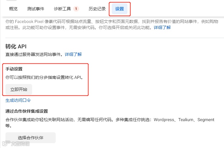 首先,选中设置标签,下拉找到转化 API,选择手动设置,点击立即开始按钮。