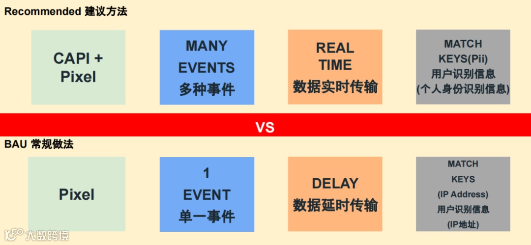 Facebook Pixel像素代码是通过客户访问网站所使用的Web浏览器发送在线活动的,而转化API是直接从服务器向Facebook分享网站和线下事件或顾客操作的。