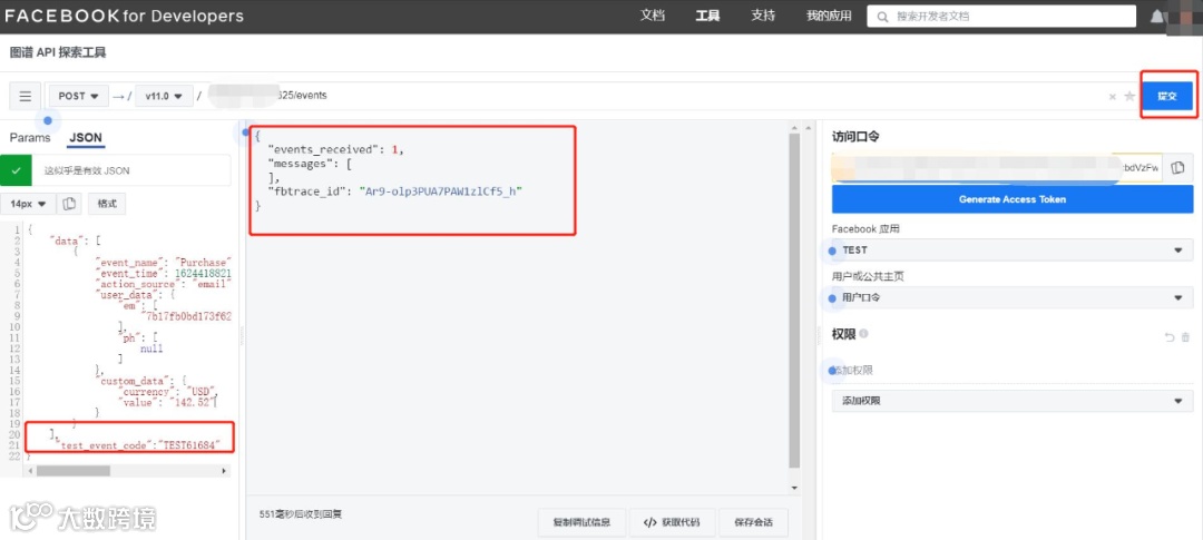 第二行:“test_event_code”:“TEST61684”(测试码需要在事件管理工具中的测试事件标签里面去复制),填写完成后点击“提交”会显示“events_received”:1