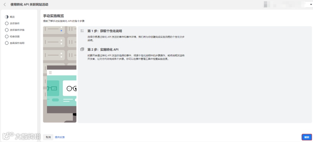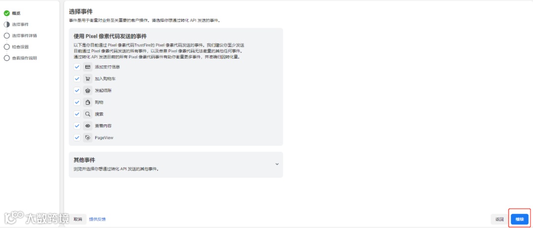 使用转化 API 关联网站活动。按照步骤进行操作,点击继续,选择要追踪的事件。每一个事件都设置一下参数,勾选需要的事件详细参数和客户信息参数即可,然后点击继续。