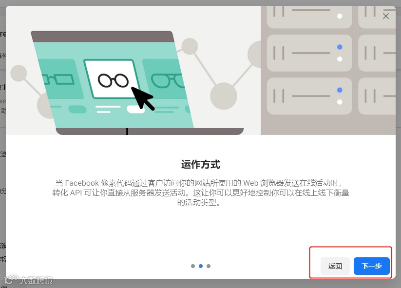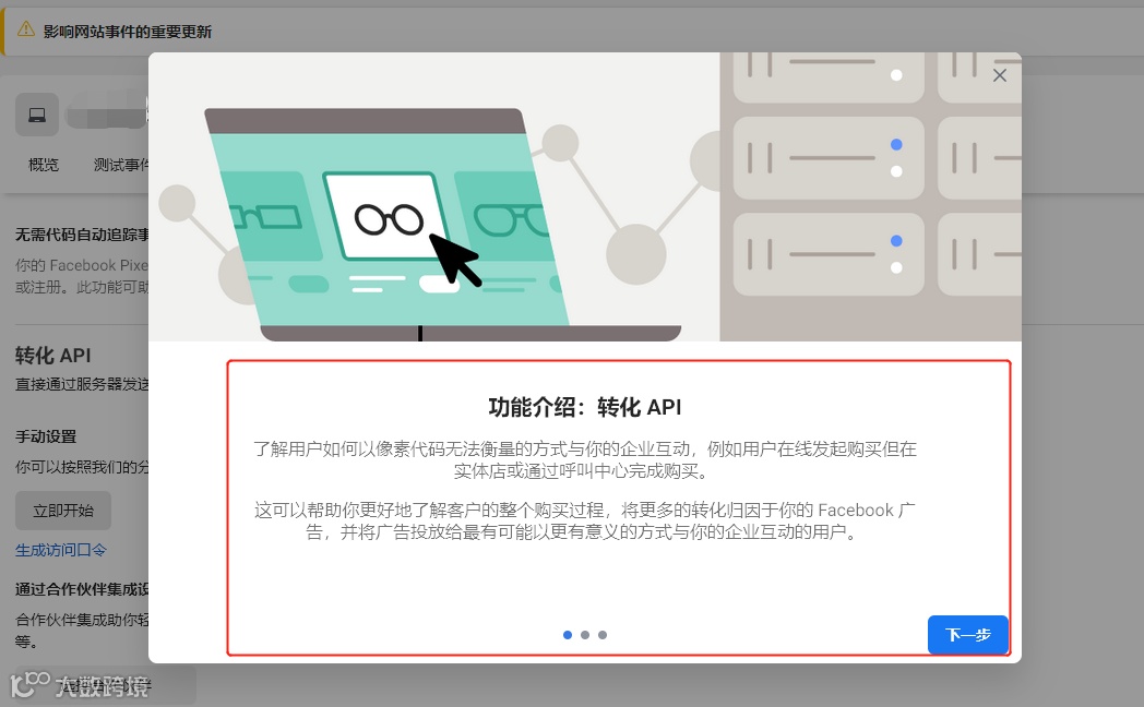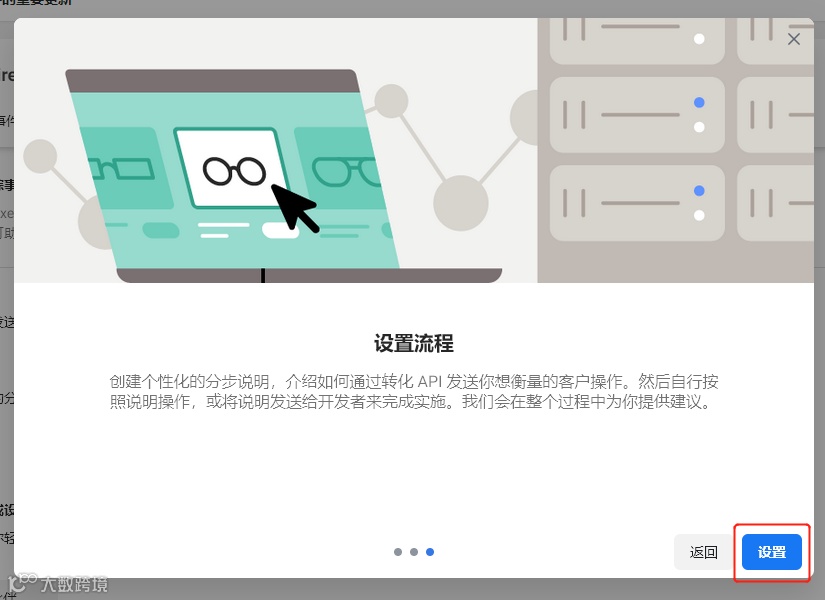 依次点击下一步即可。三张图卡分别是:转化 API功能介绍、运作方式和设置流程。
