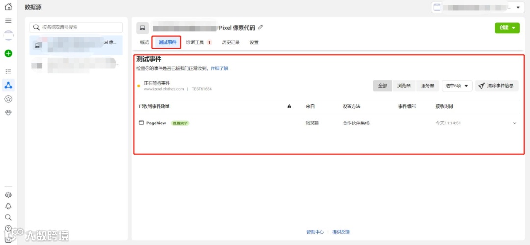 之后返回到BM的事件管理,点击“测试事件”,浏览自己的网站后,即可看到测试事件的回传,这个就说明已经设置完成了。之后每个事件按照上面的操作即可。依次去测试需要的事件: