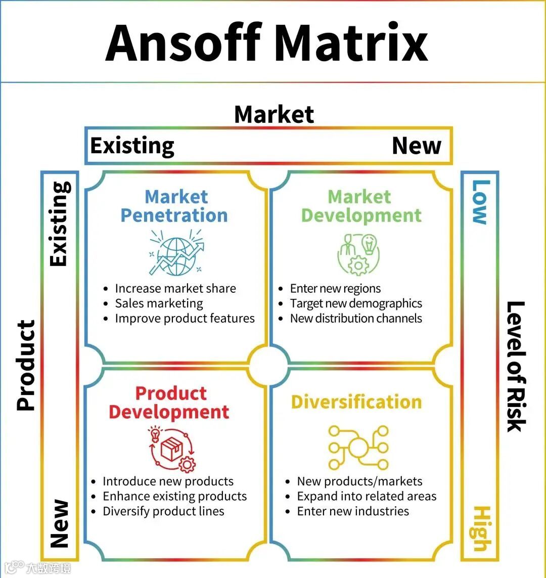 - 多元化经营(新产品 + 新市场):最高风险策略,进入全新产品与市场领域,分为相关多元化(具备业务协同性)和非相关多元化(无关联跨界),对企业资源整合与风控能力要求极高。
