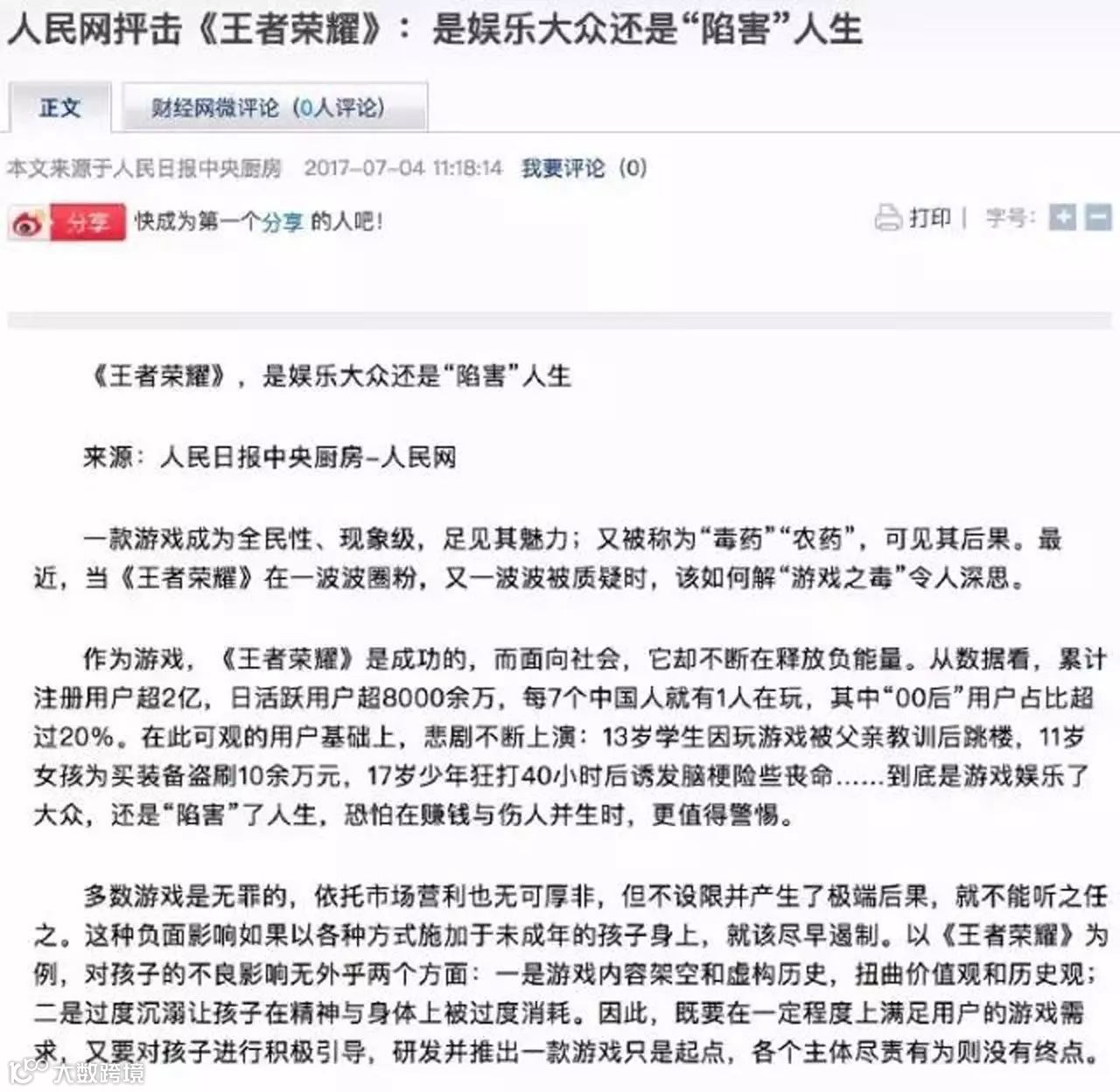 然而,当大家还在琢磨不透的时候,腾讯却在其游戏领域吃了一大亏。其由于游戏《王者荣耀》的全民化,导致部分小学生沉迷于游戏不能自拔,引起了人民网的强烈谴责,导致其股市也有所降低。