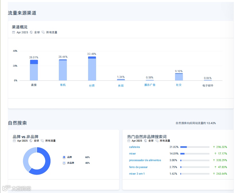 拉新与留存上,数据结构也较为健康:直接访问占比 28%,说明品牌认知已有基础;付费搜索贡献 26.7%,承担主要获客功能。