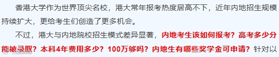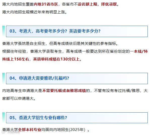 香港大学通过“内地本科生入学计划”招收内地学生,申请人可通过高考统招或独立招生渠道申请。港大不占用内地高校提前批或本科批次志愿,考生可同时报考内地大学。