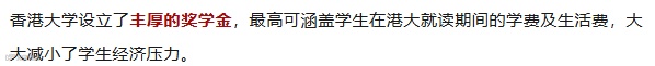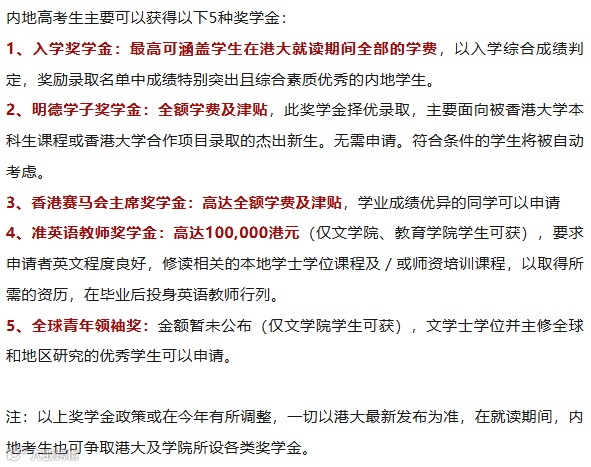 香港大学为优秀内地学生提供全额或部分奖学金,包括“校长精英奖学金”、“入学奖学金”等。获奖者可覆盖全额学费并获得额外生活补助,最高可达每年港币22万元。
