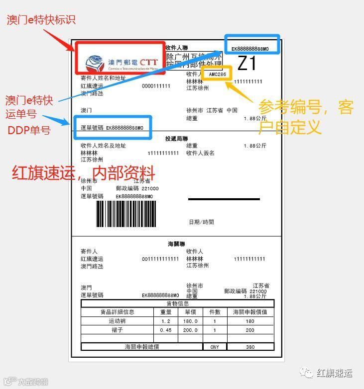 - EK888888888MO 是澳门e特快DDP模式(寄件人代理付税);