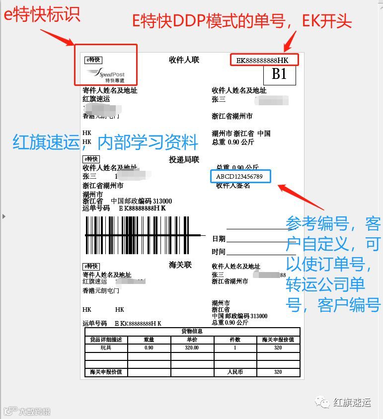- EK888888888HK 是香港e特快DDP模式(寄件人代理付税);