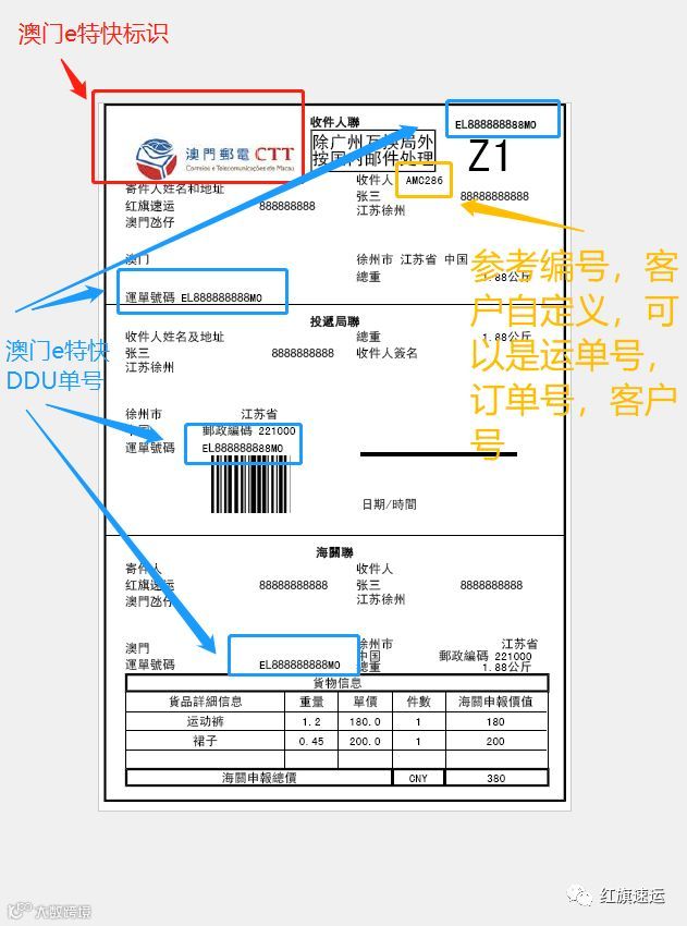 - EL888888888MO 是澳门e特快DDU模式(收件人付税)。