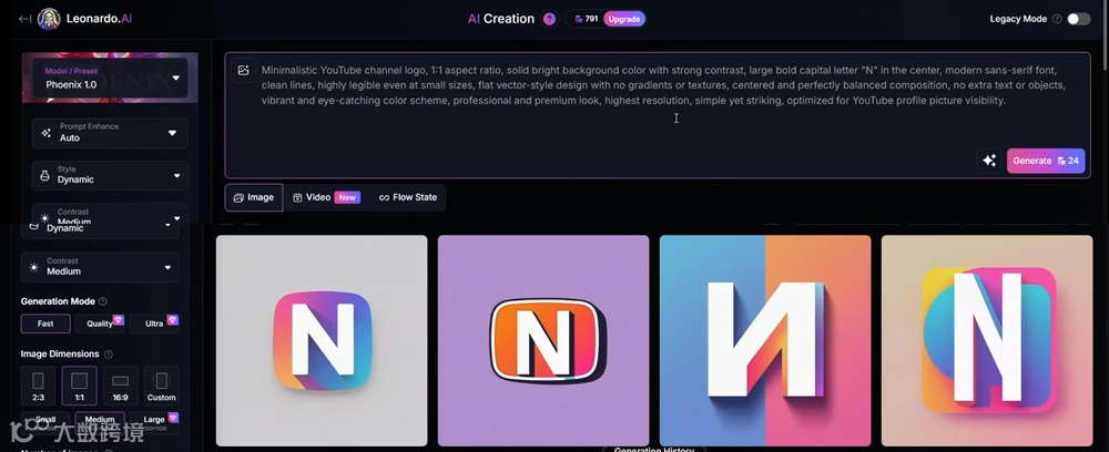 频道标志:让ChatGPT根据频道名生成图像提示词(如“简约3D风格,融合[频道名]元素,科技感配色”)。使用Leonardo AI,选择“Leonardo Phoenix”模型,设置1:1画幅,生成并下载最优选项。
