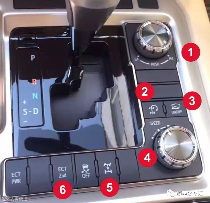 圈1是低速四驱、高速四驱的模式旋钮,按下生效,圈2是坦克转向功能,圈3是上坡辅助,圈4是蠕行功能,旋钮可以调节速度,圈5是中差锁,圈6低速起步控制。兰德酷路泽越野的“武器”全集中在了这里。