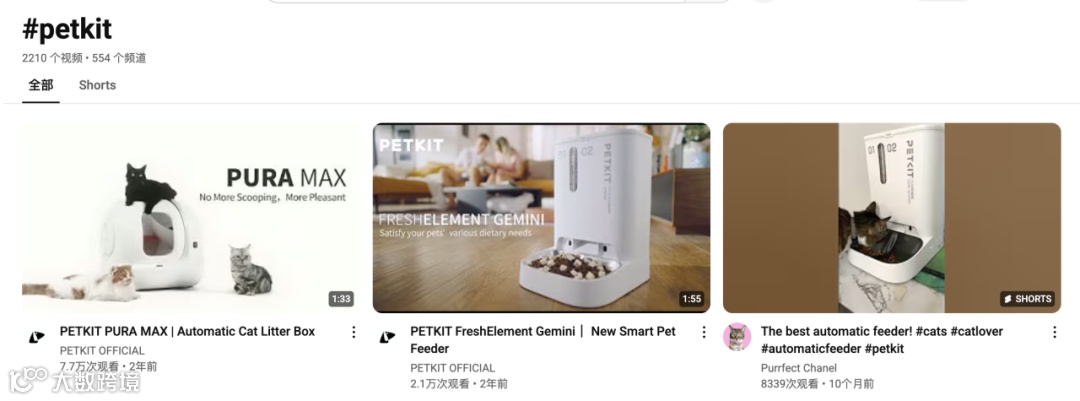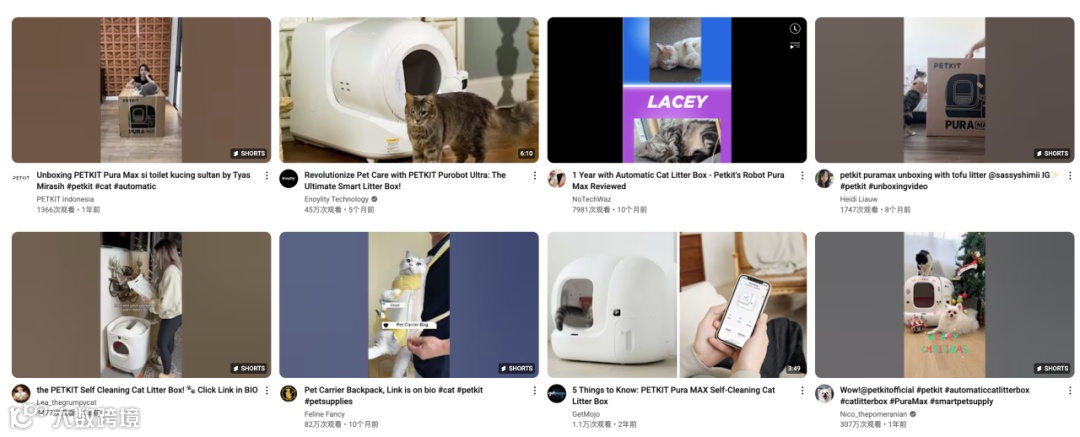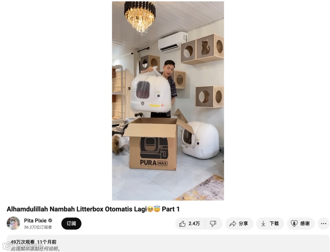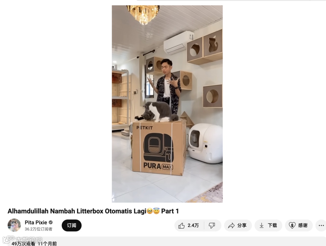 YouTube平台上,品牌Tag #petkit的中有2000+个相关视频,除了官方账号与合作的KOL视频以外,还有热爱Petkit的用户自发性的发布了品牌产品的开箱视频,引发了视频观看者的关注,有些开箱视频播放量甚至突破百万观看,这也证明了用户对Petkit产品的喜爱。而腰尾部达人 Pita Pixie 与 Petkit 的合作,则成为品牌精准渗透东南亚市场的典型样本。