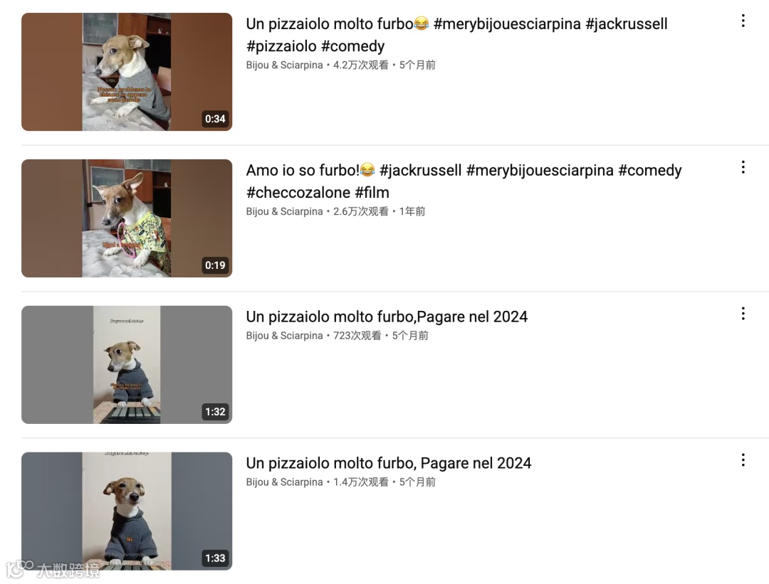拥有独特喜剧风格的 YouTube 账号 Bijou & Sciarpina,以萌宠杰克罗素犬 Bijou 为主角,通过 “聪明的披萨师傅” 等搞笑情景剧收获大量粉丝。其轻松幽默的内容不仅吸引宠物爱好者与家庭观众,更以本土化文化元素打破传播壁垒。