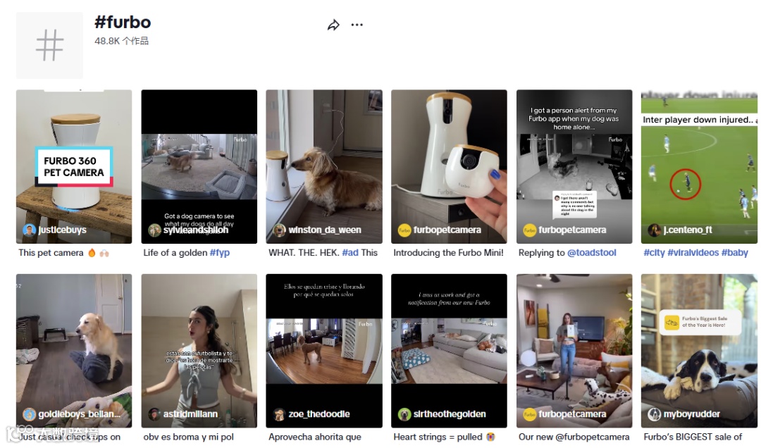 品牌营销上,在Instagram、TikTok、YouTube等社交平台发布宠物实时监测视频和日常宠物活动。在YouTube和TikTok设专属#Furbo话题,与头中尾部KOL广泛合作,同一产品多条视频数量超4万多条,Bijou & Sciarpina 就是其中一位中尾部KOL。
