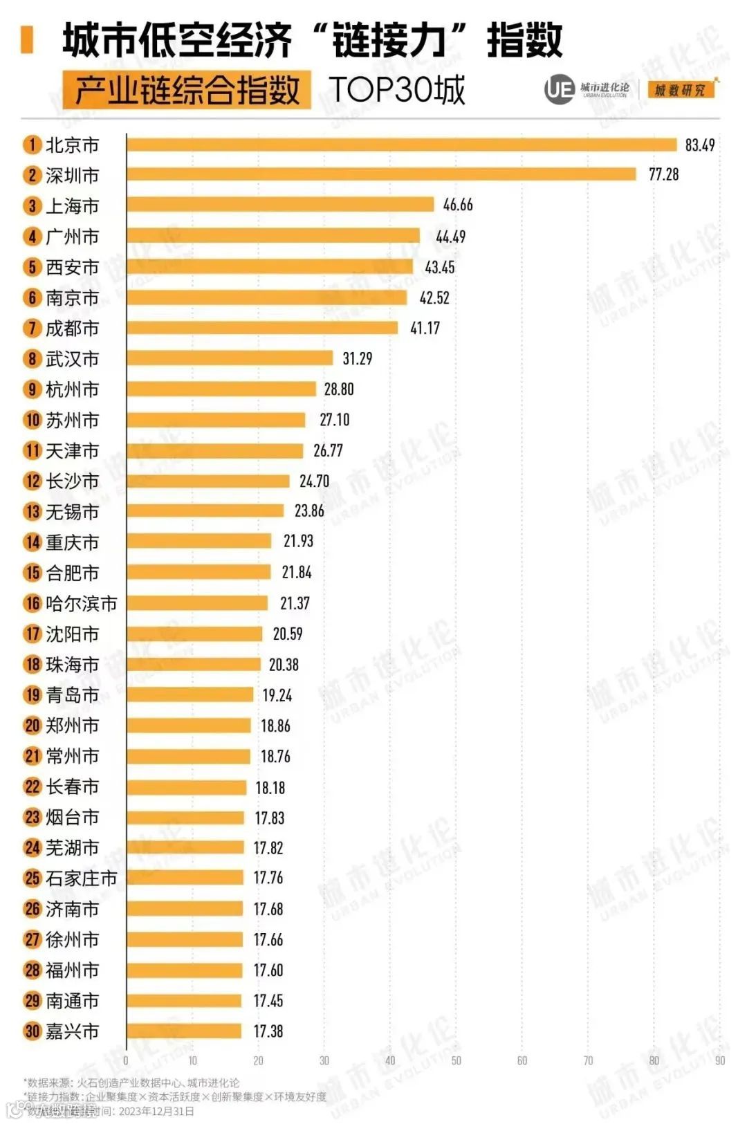 根据城市进化论联合火石创造发布《城市低空经济“链接力”指数报告(2024)》(以下简称“报告”),从企业聚集度、资本活跃度、创新聚集度、环境友好度四大维度出发,构建低空经济“链接力”指数模型,对全国271座涉及低空经济产业的城市进行评价。