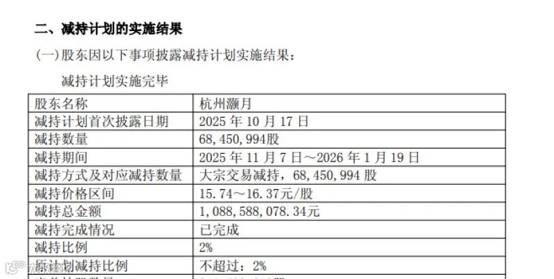 1月20日,圆通速递发布公告,公司持股5%以上股东杭州灏月企业管理有限公司已于2025年11月7日至2026年1月19日期间,通过大宗交易方式累计转让68,450,994股无限售条件流通股,占公司总股本的2%。至此,杭州灏月本次减持计划已实施完毕。其减持价格区间15.74元至16.37元,累计减持总金额为1,088,588,078.34元(约10.89亿元)。