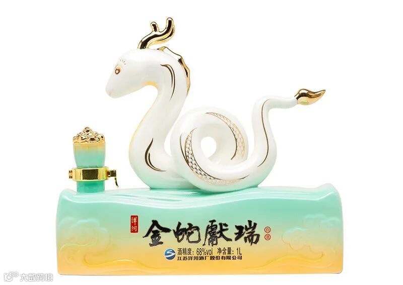 1️⃣生肖纪念酒每年推出一款,瓶身设计融合传统生肖文化与现代美学,以2025年“金蛇献瑞”为例,橙红山水底座搭配白玉蛇身,寓意吉祥富贵 ,酒精度数为68度,1000ml装在华南贸易网参考价格1680 - 1980元,极具收藏价值。