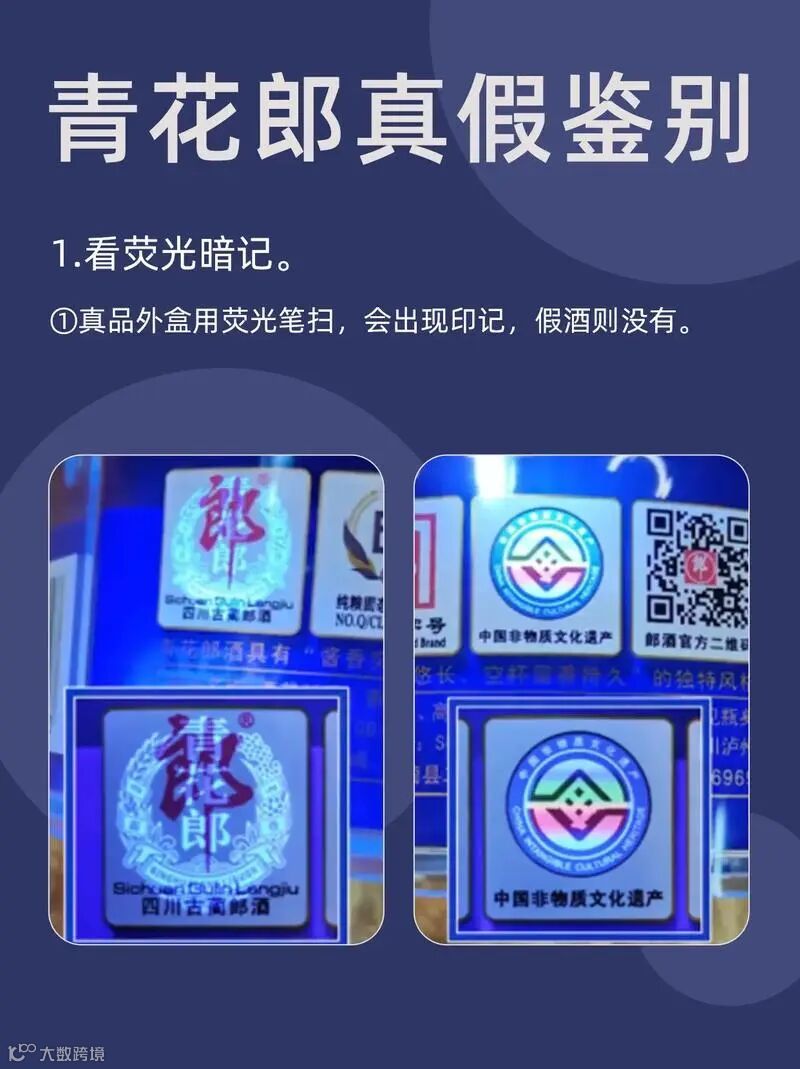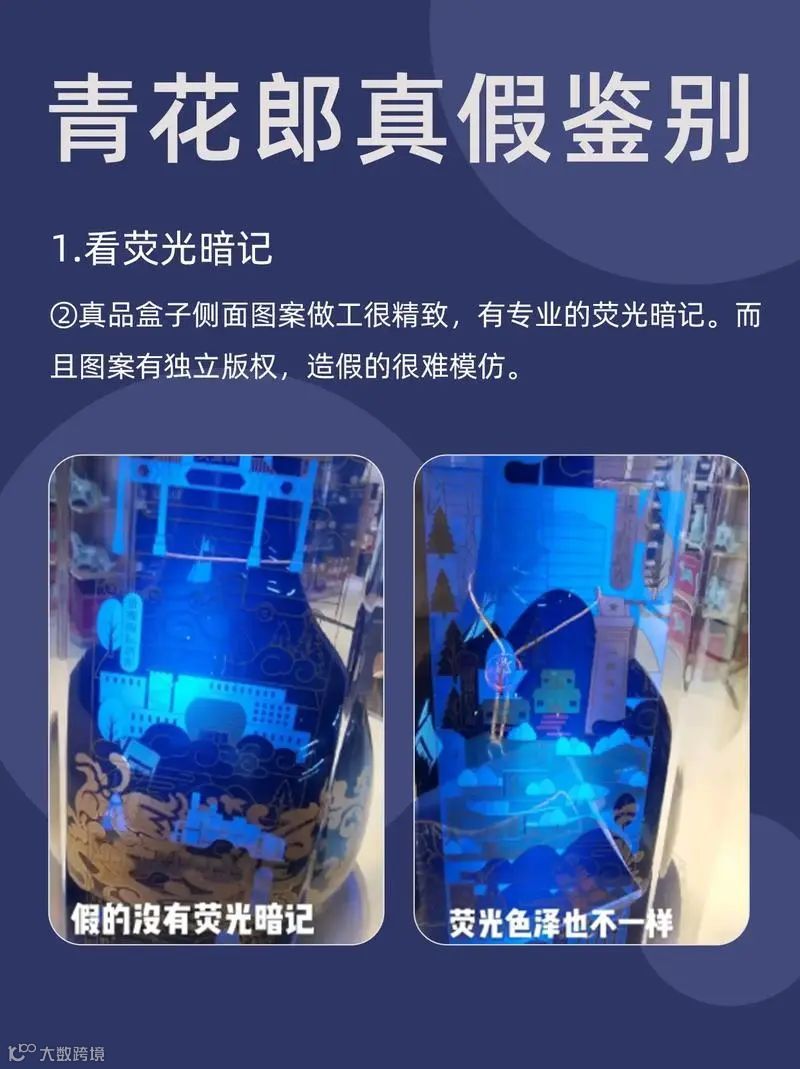 1. 外观荧光反应:用紫光灯照射,瓶身的“郎”字以及特定部位会有荧光反应。