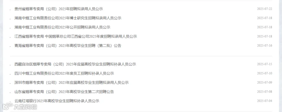 国家烟草专卖局官网、各省公司官网 “招聘专栏”或者关注“国家烟草专卖局”“中国烟草招聘”等官方公众号获取实时更新。