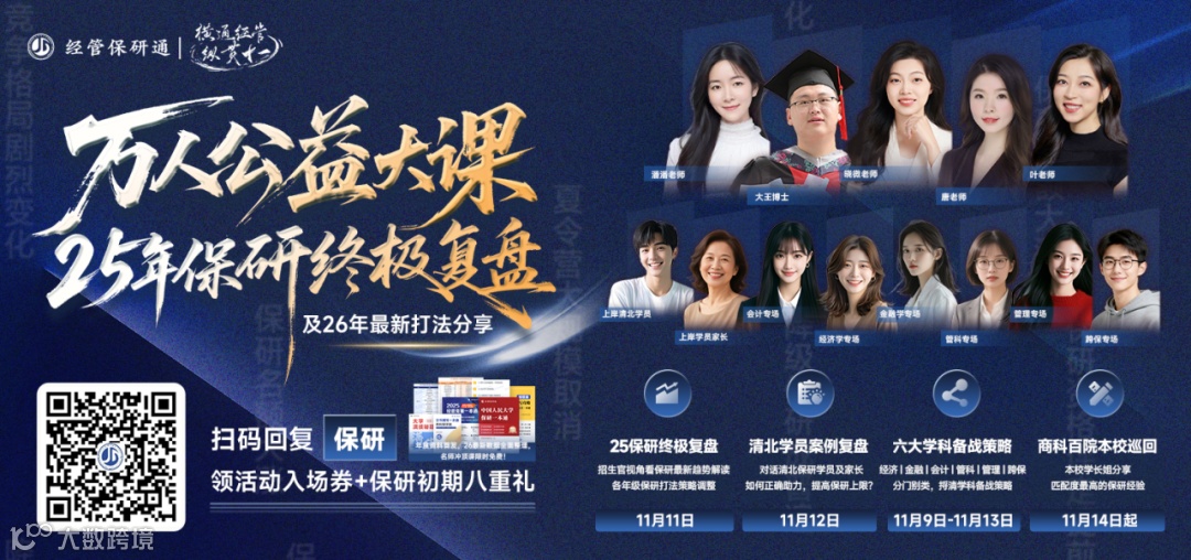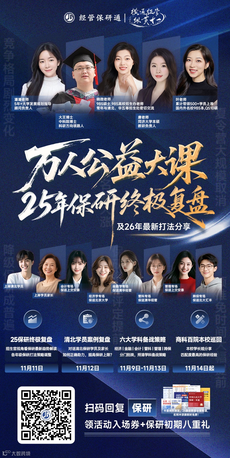 今年,我们将经管万人公益大课分为四大板块!针对25年保研政策变革影响,预判26年保研趋势;以不变应万变,带你扩大先发优势,提前锁定名校offer!