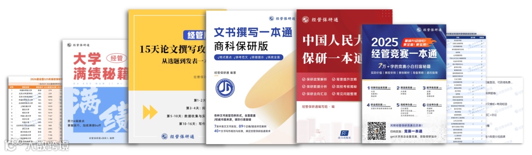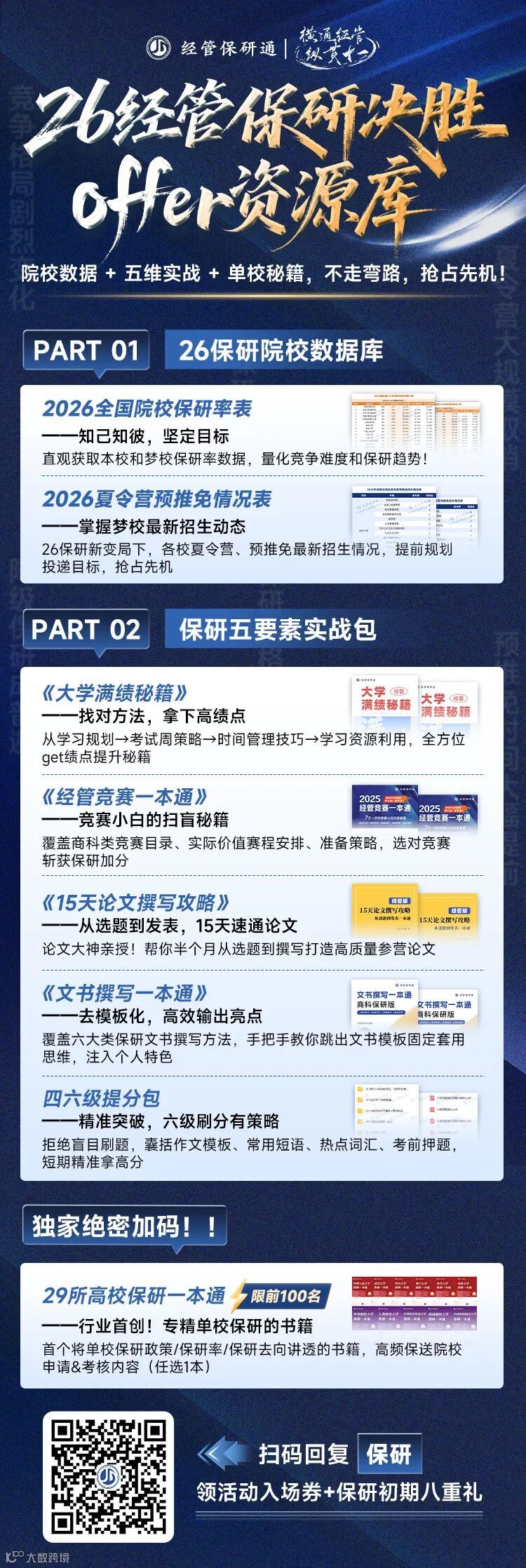 这其中,有政策改革后,26最新保研动态的《夏令营/预推免情况表》、帮你拿下校内保研名额的3大加分项《大学满绩秘籍》+《经管竞赛一本通》+《15天论文撰写攻略》、协助斩获校外offer的《文书撰写一本通》+《六级提分包》。