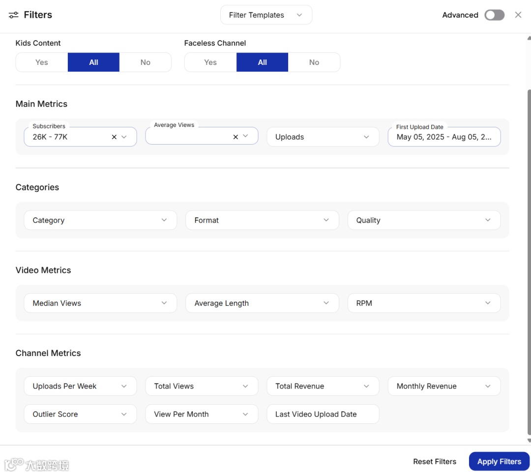 设有专门的“Faceless Outliers”模块,聚焦无需出镜的热门频道,适合希望保护隐私或批量运营的创作者参考。