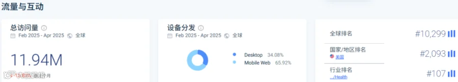 从排名来看,该网站全球排名第10,299,美国排名第2,093,行业排名第107,显示出其在行业内的较强竞争力。