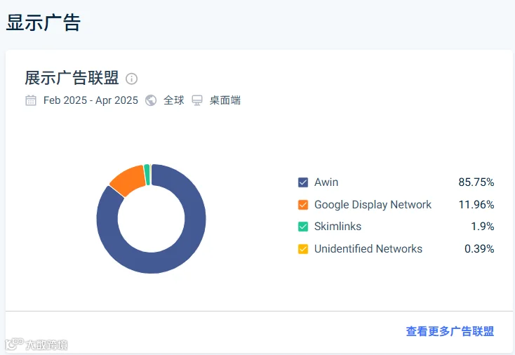 该网站的广告策略较为有效,展示广告构成了网站流量的1.24%,其中Awin贡献了85.75%、Google Display Network贡献了11.96%、Skimlinks贡献了1.9%,这表明其广告投放策略精准。
