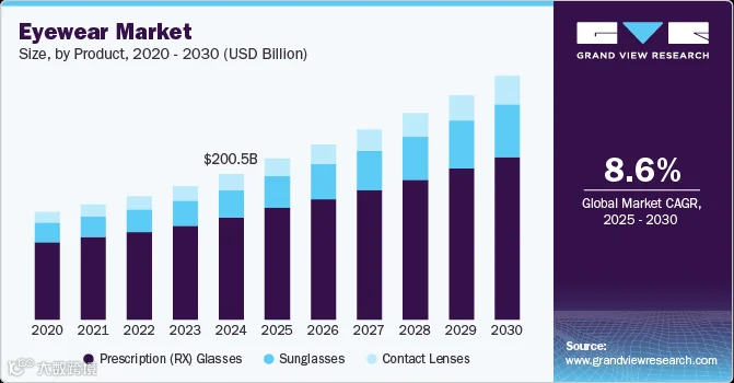 2024年全球眼镜市场规模为2004.6亿美元,预计2025年至2030年的复合年增长率为8.6%。