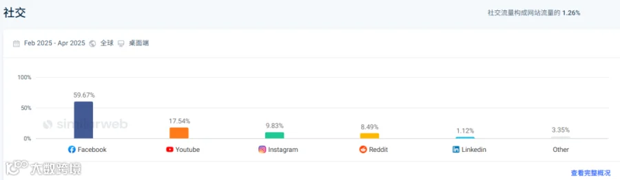 在自然搜索中,品牌关键词搜索占比高达77%,显示出较高的品牌知名度和用户忠诚度。社交流量占1.26%,Facebook贡献了其中的59.67%,显示出该网站在社交媒体上具有一定的影响力。