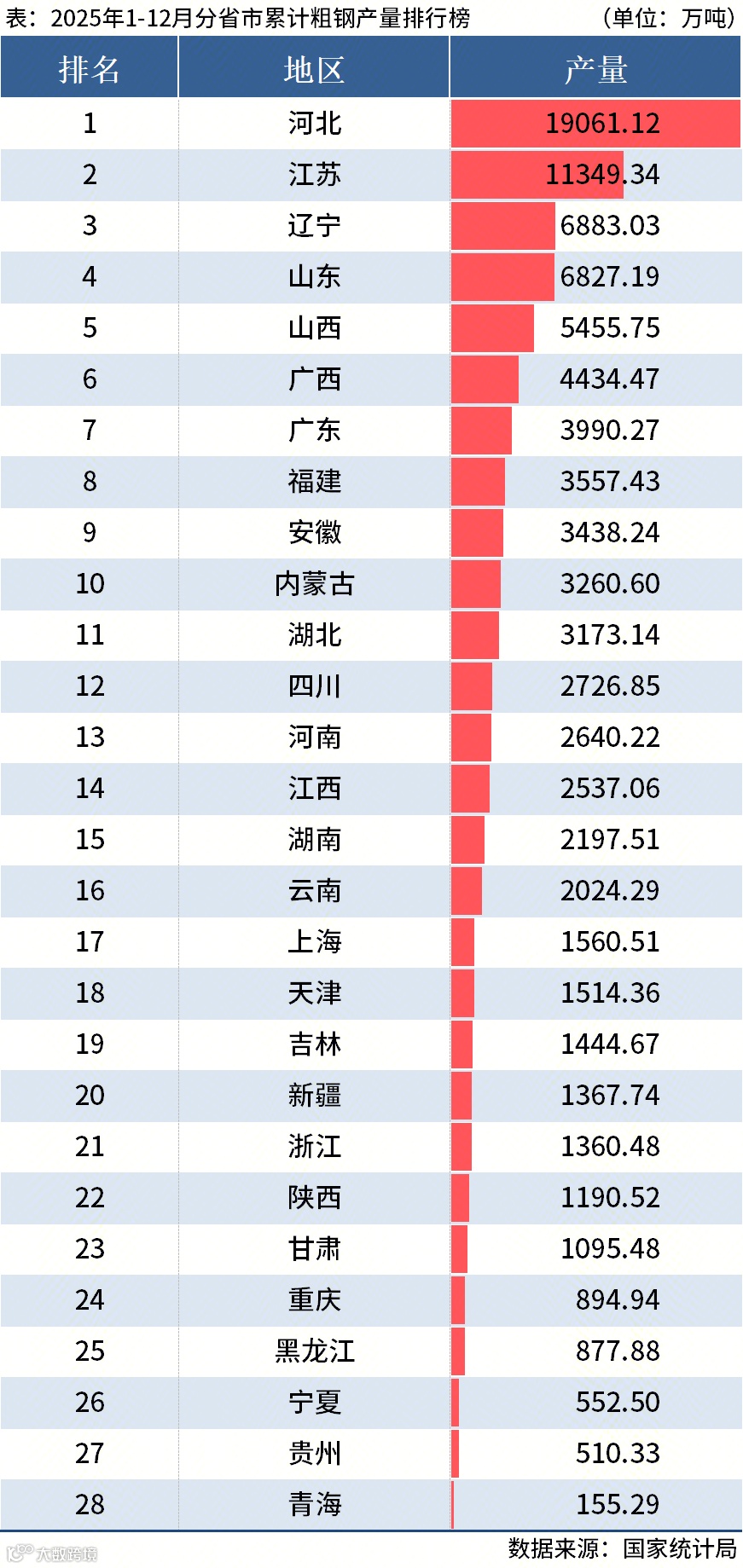从分省市数据来看,2025年全年河北以产量19061.12万吨位列第一;江苏产量11349.34万吨排在第二;辽宁产量6883.03万吨排在第三。