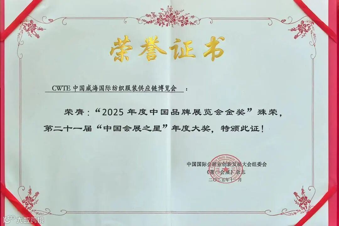 11月7日,协会主办的中国威海国际纺织服装供应链博览会(简称“CWTE威海纺织展”)凭借其卓越的品牌影响力、显著的行业带动效应及创新的展会服务,荣获 “2025中国最具影响力展览会、品牌展览会·金奖”荣誉。