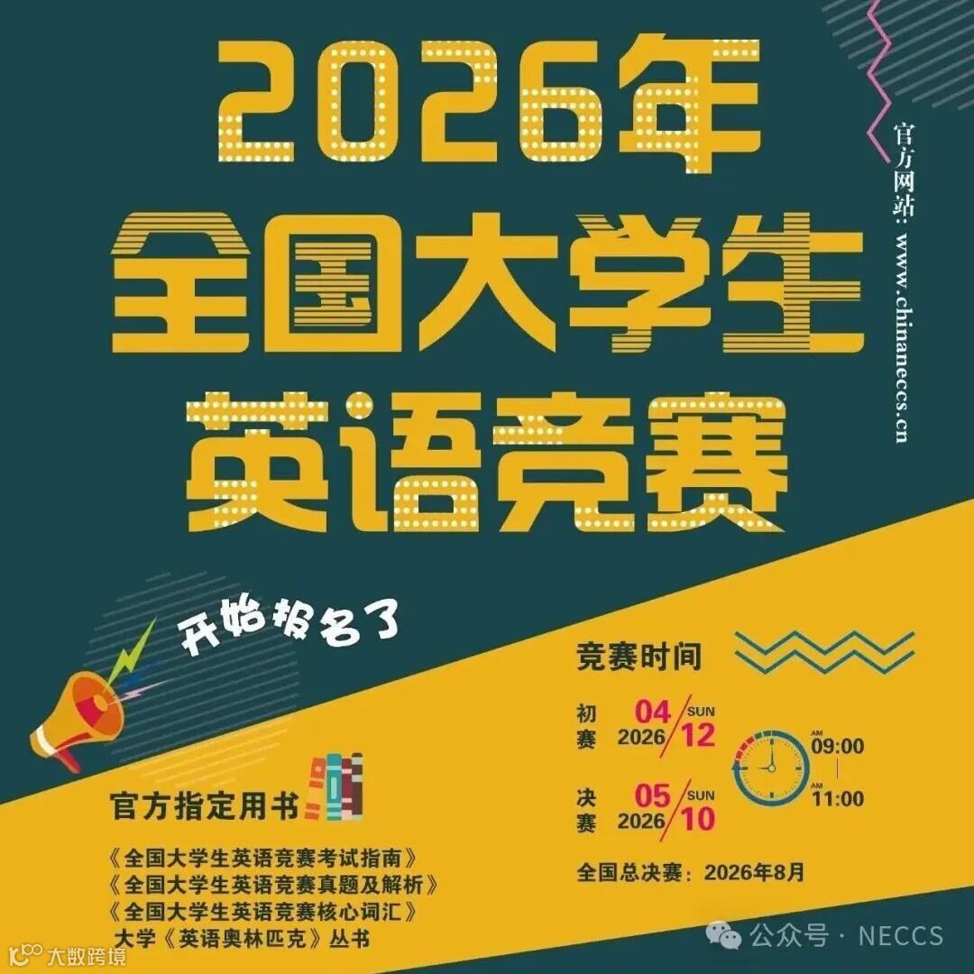 2026年全国大学生英语竞赛(NECCS),即第二十八届全国大学生英语竞赛预计将于2025年12月17日--2026年3月13日报名,2026年4月12日(周日)举行全国初赛;2026年5月10日(周日)举行全国决赛。