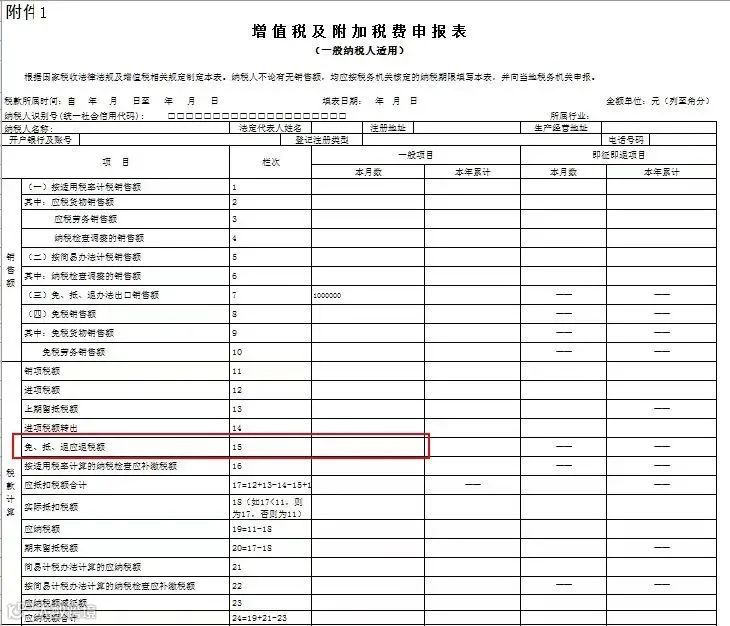 - 将出口销售额100万元填写在《附列资料(一)》第16栏“货物及加工修理修配劳务销售额”。