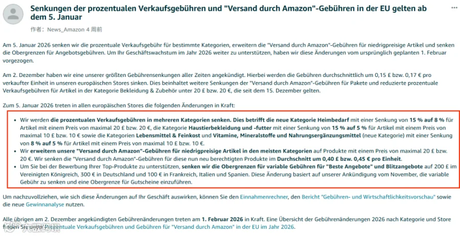 除大促安排外,亚马逊欧洲站同步宣布了一项更具长期影响的调整:自2026年1月5日起,亚马逊将下调多类商品的销售佣金比例,并扩大低价商品的FBA费用优惠范围。