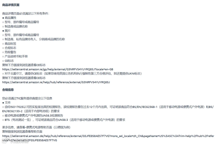 上述商品均涉及内置锂离子或锂聚合物电池,属于平台重点监管品类。与此同时,亚马逊明确要求,商品详情页面需完整展示: