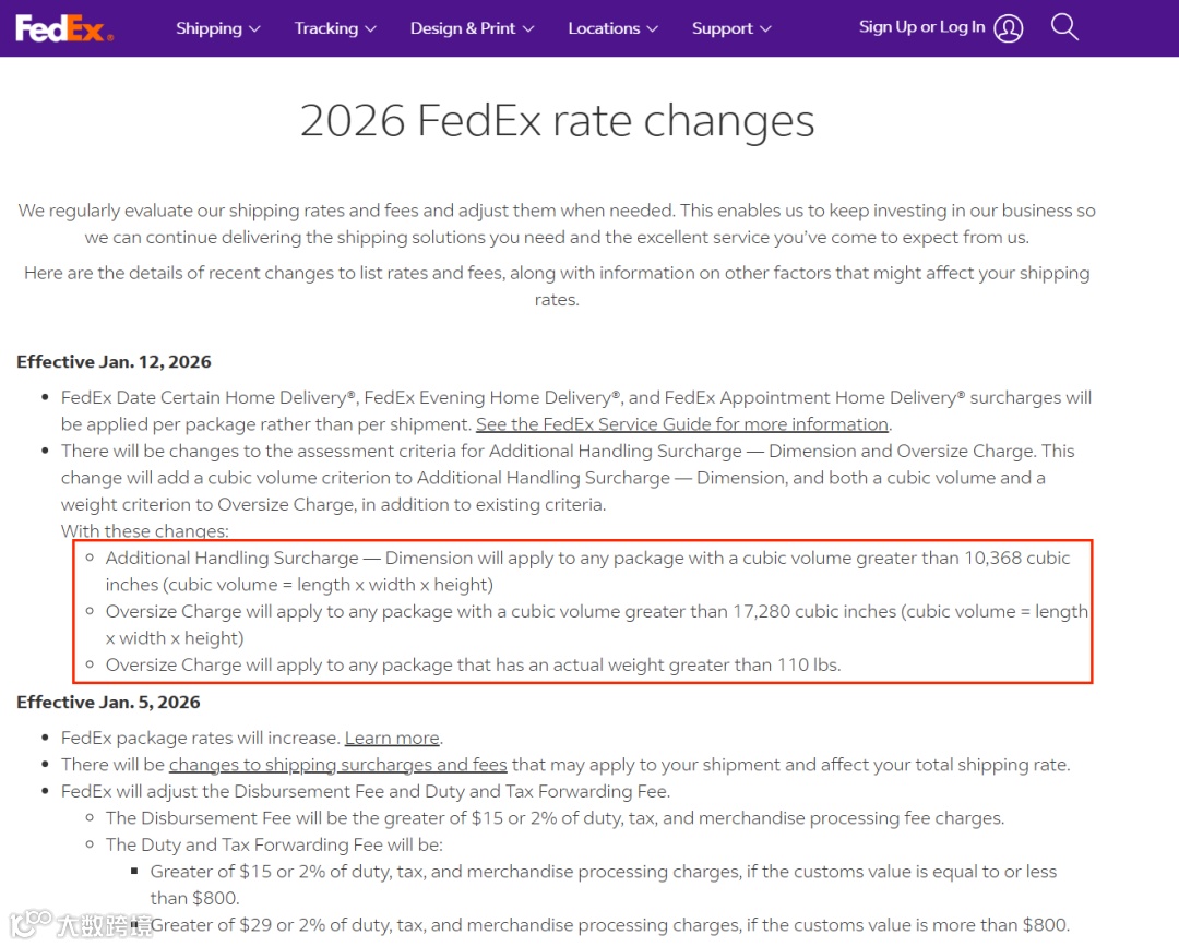 进入2026 年,国际快递巨头FedEx与UPS几乎同步收紧了美国境内的大件及附加处理费的判定标准。