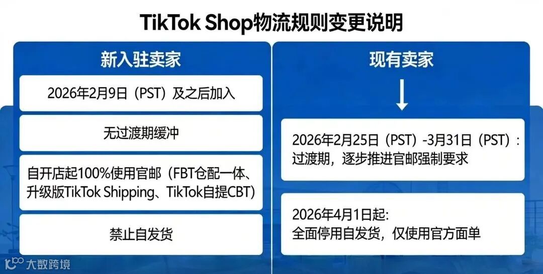 对于老卖家而言(2026年2月9日之前入驻的卖家):卖家需逐步切换至TikTok Shop官方物流服务,3月31日之后自发货模式将彻底停用。