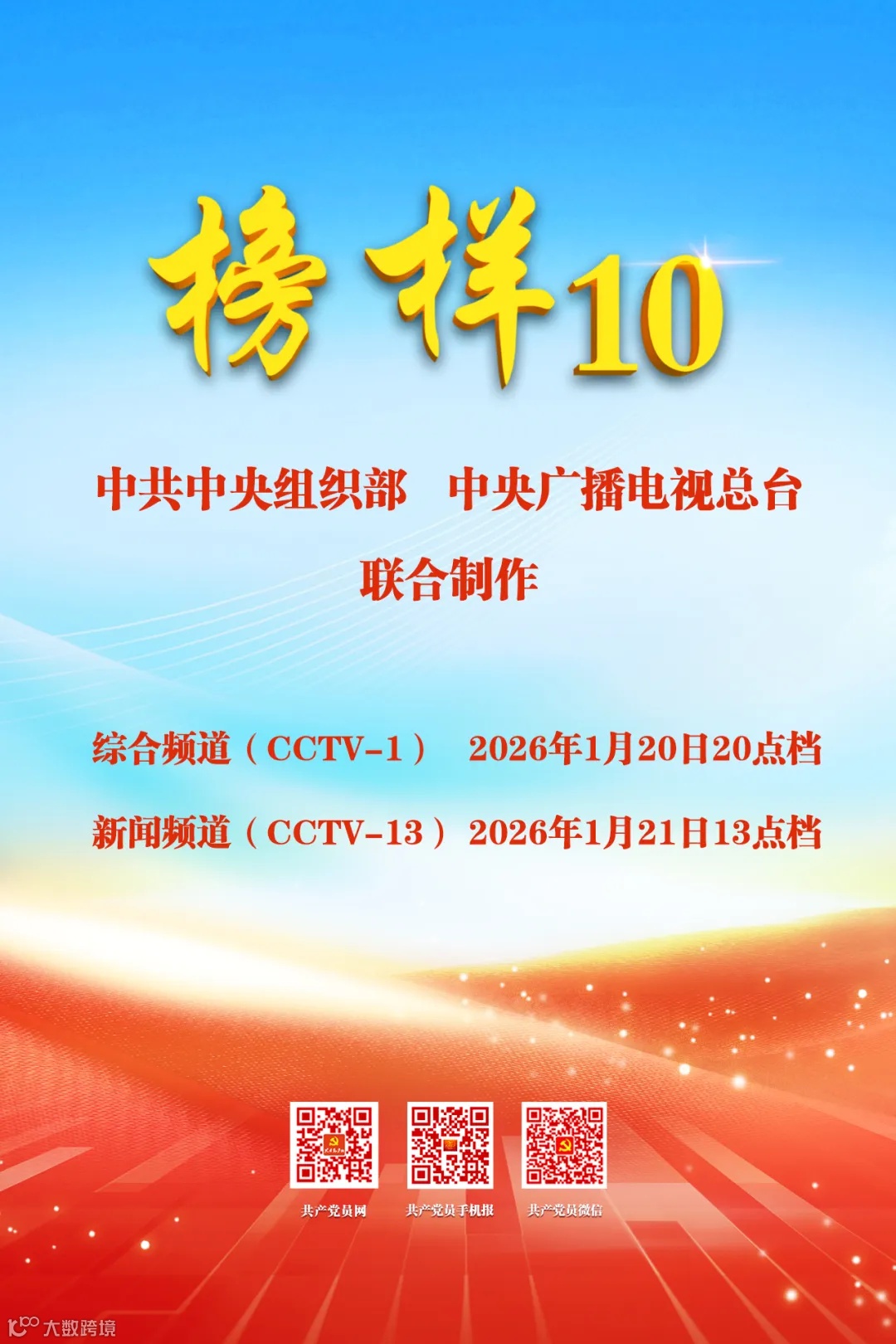 该节目将于2026年1月20日在中央电视台综合频道(CCTV-1)晚间8点档首播,1月21日在中央电视台新闻频道(CCTV-13)13点档重播,在共产党员网(www.12371.cn)、共产党员手机报(12371.people.com.cn)、共产党员微信(gcdyweixin)、全国党员干部现代远程教育专用频道集中展播。共产党员网首页提供节目下载。请学习收看。