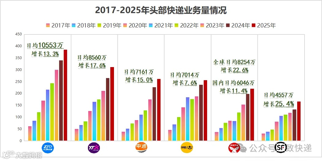 本周,六大头部快递企业相继披露2025年全年件量数据,行业排名格局明朗。中通实现常态化日均件量破亿,顺丰同比增速持续领跑,申通件量反超韵达,市占率呈现“三升三降”态势。