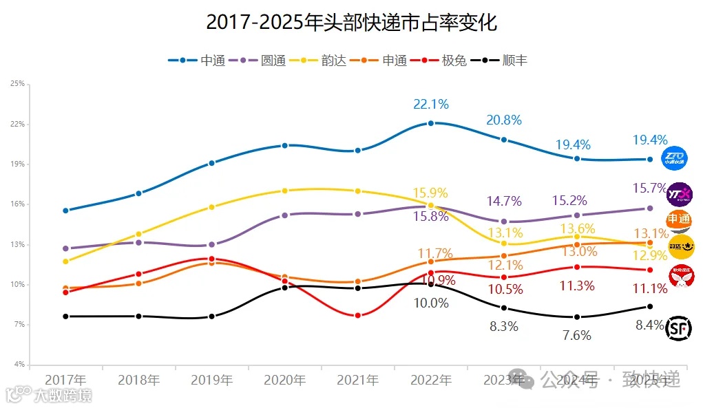 2025年最大变化是申通反超韵达,以13.1%的市占率领先后者0.2个百分点,实现连续四年提升;韵达则在短暂反弹后再度下滑。