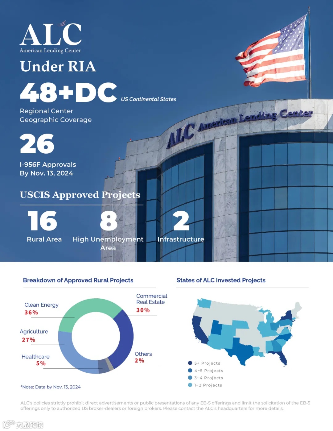 作为美国最大规模的非银行借贷机构之一,ALC深耕联邦与州政府担保企业贷款领域,通过将其与EB-5深度融合,显著降低投资风险,致力于保障投资人顺利移民与资金安全。