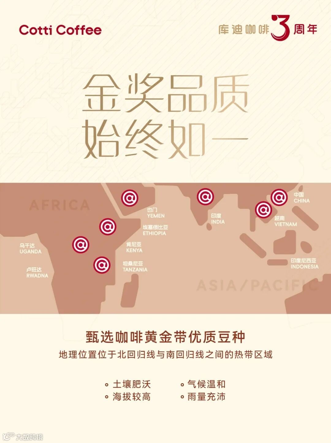 2025 年,库迪继续深化全球溯源战略,通过与埃塞俄比亚、巴西、哥伦比亚、乌干达、卢旺达等咖啡豆核心产区合作,锁定了高等级原豆的持续供应,托底全国门店的出品一致性。