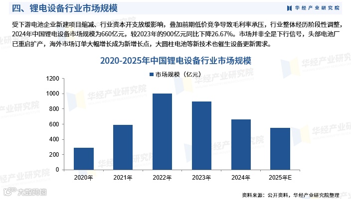受电池企业新建项目减少、资本开支放缓以及前期低价竞争影响,行业进入阶段性调整期。2024年中国锂电设备市场规模为660亿元,较2023年的900亿元同比下降26.67%。尽管整体承压,但市场仍存积极信号:头部电池企业重启扩产,海外市场订单显著增长,大圆柱电池等新技术迭代带动设备更新需求,成为行业复苏的重要驱动力。