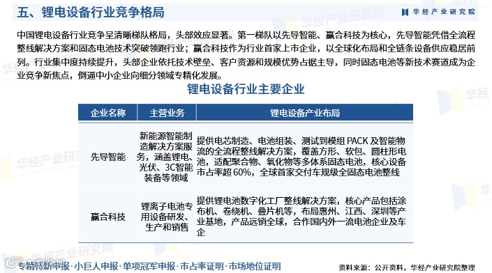 中国锂电设备行业呈现明显的梯队化竞争格局,头部效应突出。第一梯队以先导智能、赢合科技为代表:先导智能凭借全流程整线解决方案及在固态电池领域的技术突破保持领先;赢合科技作为行业首家上市企业,依托全球化布局和全链条设备供应稳居前列。行业集中度持续提升,头部企业依靠技术壁垒、客户资源和规模优势占据主导地位。同时,固态电池等新兴技术赛道加速发展,促使中小企业聚焦细分领域,走专业化、精细化发展路径。
