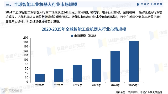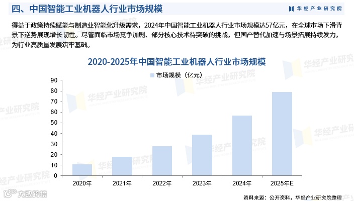 受益于政策支持与制造业智能化转型,2024年中国智能工业机器人市场规模达57亿元,在全球市场整体下滑背景下仍保持增长韧性。尽管面临核心技术瓶颈与竞争加剧挑战,但国产化进程加快及应用场景持续拓展,为行业高质量发展奠定基础。