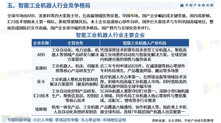 全球市场由ABB、发那科等“四大家族”主导,高端领域优势明显。中国市场则呈现本土企业快速崛起态势,埃斯顿、汇川技术领跑第一梯队,新松等紧随其后。当前形成国际巨头占据高端、国产企业主攻中端的格局,国产替代与全球化竞争同步推进。