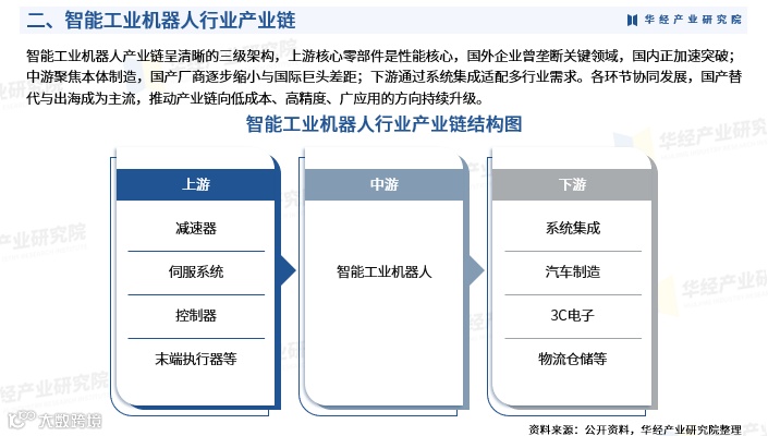 智能工业机器人产业链呈三级架构:上游核心零部件曾长期被国外企业垄断,国内正加速技术突破;中游本体制造领域,国产厂商与国际巨头差距逐步缩小;下游系统集成广泛适配汽车、电子、新能源等行业需求。全产业链协同发展,国产替代与出海成为主流趋势,推动行业向低成本、高精度、广应用方向升级。
